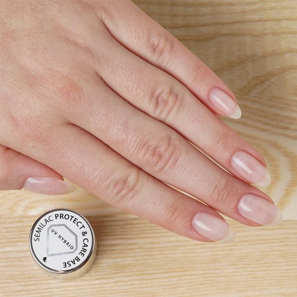 Η ημιμόνιμη βάση Semilac Protect & Care Base προορίζεται για άτομα με λεπτά, εύθραυστα νύχια με τάση να σπάνε. Εμπλουτισμένη με πρωτεΐνες, έλαιο τσαγιού, σκόνη διαμαντιού, εκχύλισμα από λάχανο, βιοτίνη και γλυκερίνη. Η παχύρευστη και σκληρή βάση δημιουργεί μία προστατευτική επίστρωση και την προστατεύει από τους εξωτερικούς παράγοντες. Τα νύχια με αυτόν τον τρόπο είναι ενισχυμένα και αναδομούνται πιο εύκολα. Η διάφανη βάση επιτρέπει την φυσική ενίσχυση και επιμήκυνση της φυσικής πλάκας του νυχιού.