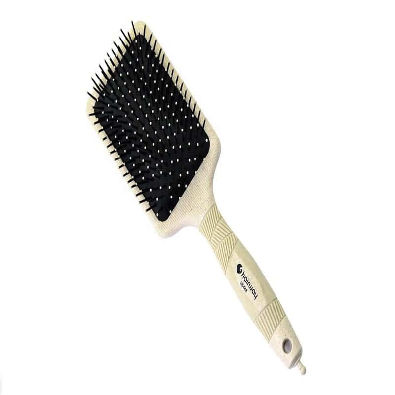 Η άκαμπτη κεφαλή της βούρτσας διαθέτει σχισμές εξαερισμού σε σχήμα ζιγκ-ζαγκ και στρογγυλεμένες, ανθεκτικές στη θερμότητα τρίχες από πολυαμίδιο για απαλό ξεμπέρδεμα.
