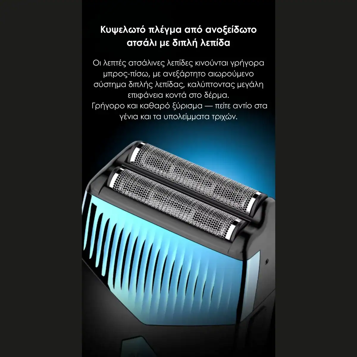 Η κουρευτική μηχανή και το trimmer διαθέτουν λεπίδες από ανοξείδωτο ατσάλι για ακριβές και καθαρό αποτέλεσμα. Το shaver είναι εξοπλισμένο με διπλή λεπίδα από ανοξείδωτο ατσάλι, η οποία κινείται σε δύο κατευθύνσεις για μεγαλύτερη κάλυψη στο πρόσωπο και πιο αποτελεσματικό ξύρισμα. Το trimmer μύτης διαθέτει σύστημα κοπής 360° με 9 οπές, προσφέροντας γρήγορη και ασφαλή περιποίηση χωρίς να τραυματίζει την ευαίσθητη περιοχή.