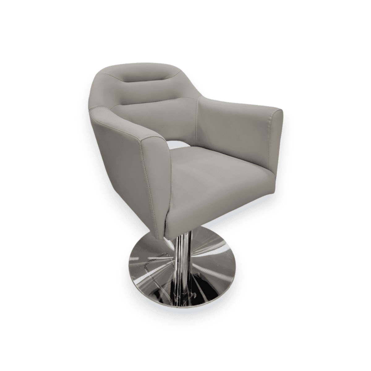 Καρέκλα κομμωτηρίου με μοντέρνο σχεδιασμό, επένδυση σε γκρι δερματίνη και βάση με μηχανισμό για εύκολη ρύθμιση ύψους