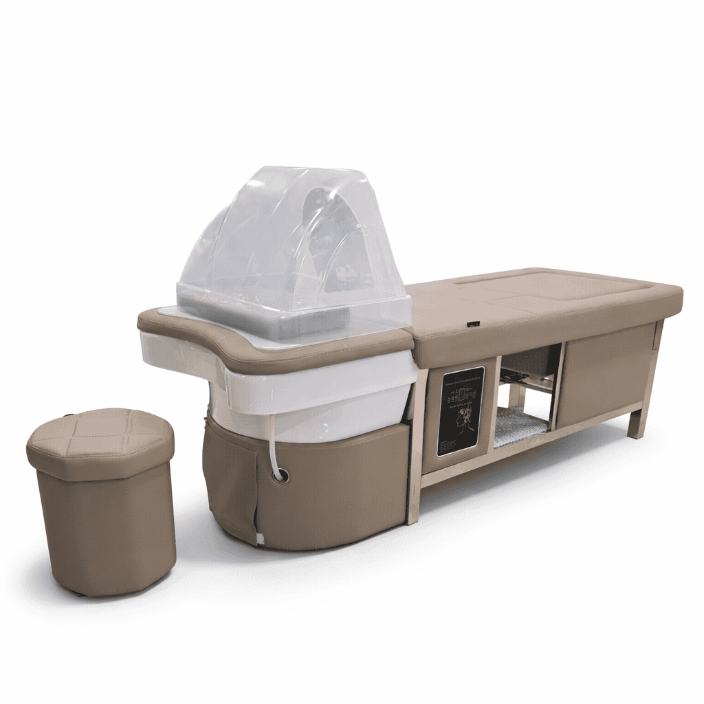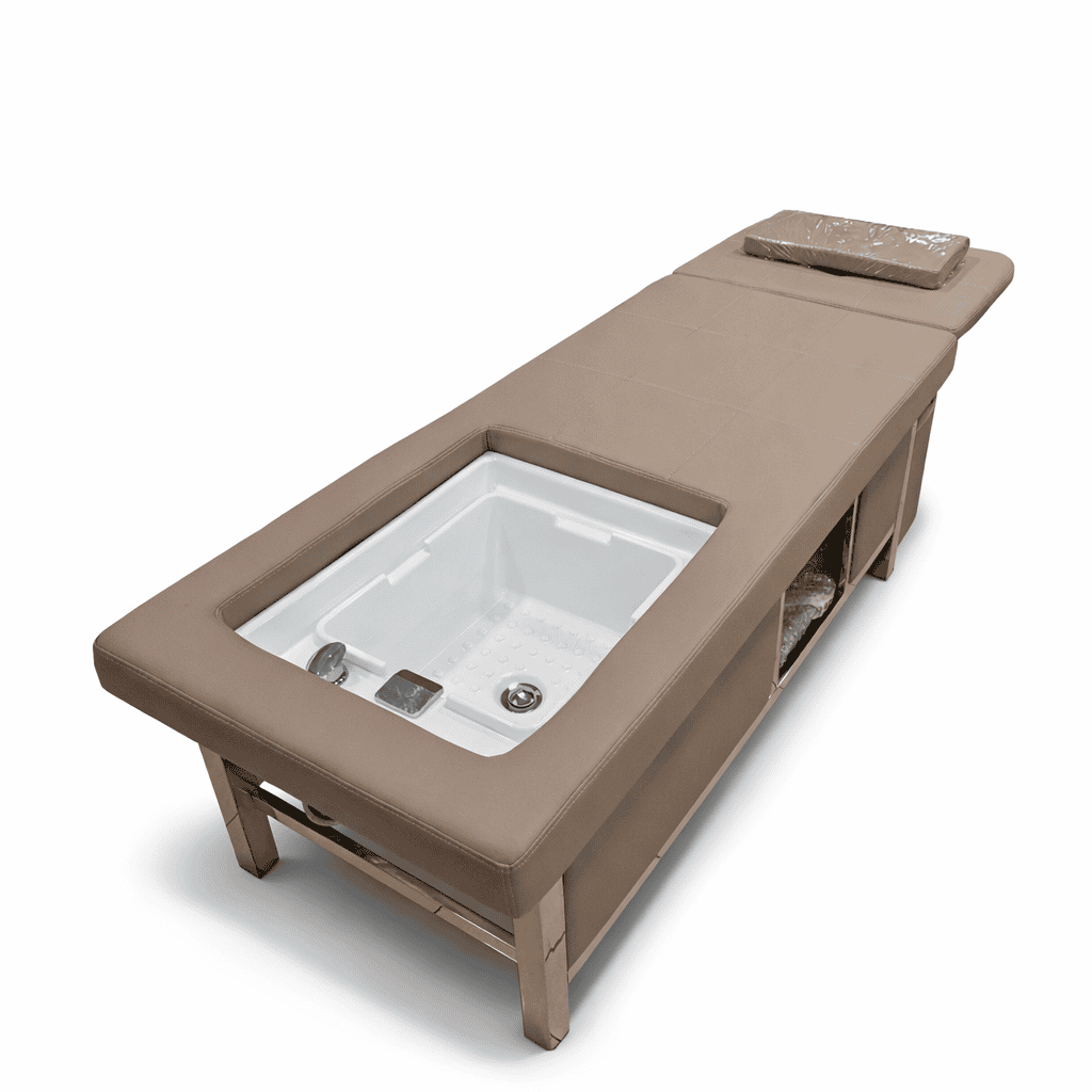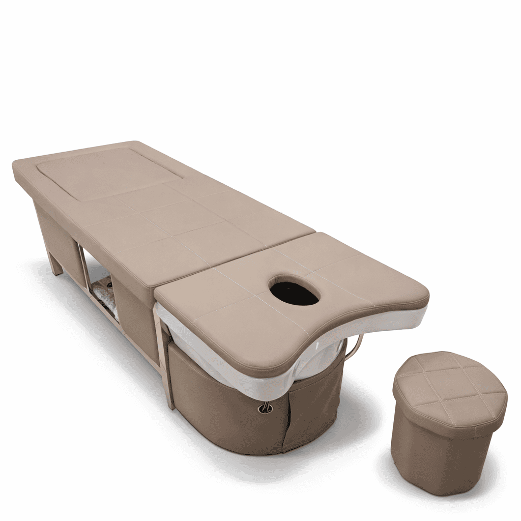 Επαγγελματικό κρεβάτι για θεραπείες κεφαλής, σώματος και ποδιών, ιδανικό για Japanese Head Spa, υδροθεραπείες και μασάζ, με ενσωματωμένο ποδόλουτρο και εργονομικό σχεδιασμό υψηλής αισθητικής.