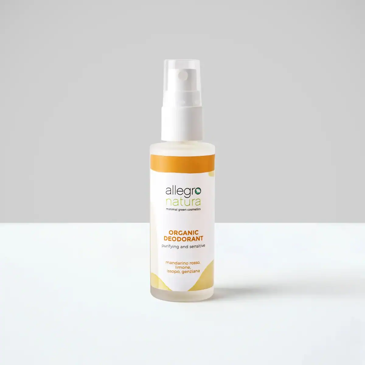 Το Allegro Natura Organic Αποσμητικό με Λεμόνι και Κόκκινο Μανταρίνι είναι ένα απαλό και εξυγιαντικό αποσμητικό, σχεδιασμένο να προστατεύει την επιδερμίδα από τις δυσάρεστες οσμές, αφήνοντας το σώμα να αναπνέει φυσικά. Η σύνθεσή του προσφέρει φυσική προστασία χάρη στη δράση του Triethyl Citrate, που συμβάλλει στη ρύθμιση του pH της επιδερμίδας, και του Zinc Lactate, γνωστού για τις αντιβακτηριακές του ιδιότητες. Το βιολογικό νερό Ύσσωπου βοηθά στην εξισορρόπηση της επιδερμίδας, ενώ η βιολογική Aloe προσφέρει ενυδάτωση και θρέψη. Η σύνθεση ολοκληρώνεται με εκχύλισμα βιολογικής Γεντιανής με εξυγιαντική δράση. Τα αιθέρια έλαια βιολογικού Λεμονιού και Κόκκινου Μανταρινιού χαρίζουν φρέσκο και ευχάριστο άρωμα που διαρκεί όλη την ημέρα.