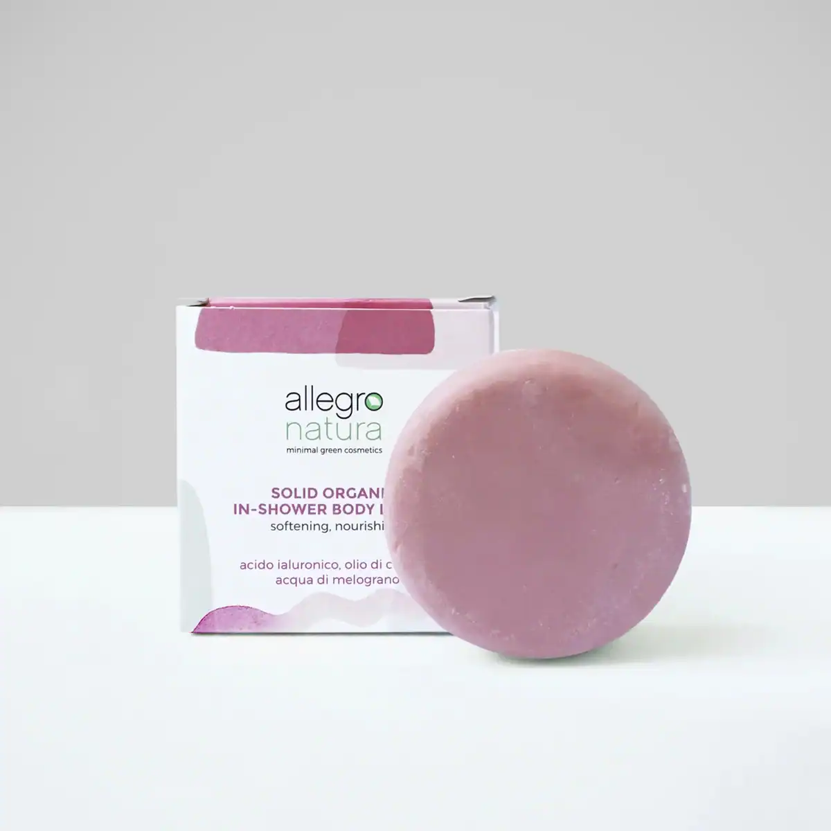Η Allegro Natura Organic Στερεή Κρέμα Σώματος για το Ντους είναι ένα προϊόν περιποίησης που μετατρέπει την καθημερινή ρουτίνα του ντους σε μια εμπειρία θρέψης και απαλότητας. Εφαρμόζεται μετά τον καθαρισμό και βοηθά την επιδερμίδα να αποκτήσει πιο απαλή, βελούδινη και μεταξένια αίσθηση. Η σύνθεσή της περιέχει Βούτυρο Κακάο, βιολογικό Βούτυρο Καριτέ, βιολογικό έλαιο Αμυγδάλου και βιολογικό έλαιο Καρύδας, συστατικά που προσφέρουν θρέψη και συμβάλλουν στην ελαστικότητα και τη μεταξένια όψη της επιδερμίδας. Το έλαιο Κερασιού και το βιολογικό νερό Ροδιού, πλούσια σε αντιοξειδωτικά, χαρίζουν απαλότητα και φωτεινότητα. Η σύνθεση ολοκληρώνεται με Υαλουρονικό Οξύ διαφορετικών μοριακών βαρών, που προσφέρει ενυδάτωση και συμβάλλει σε πιο απαλή και λεία αίσθηση της επιδερμίδας.