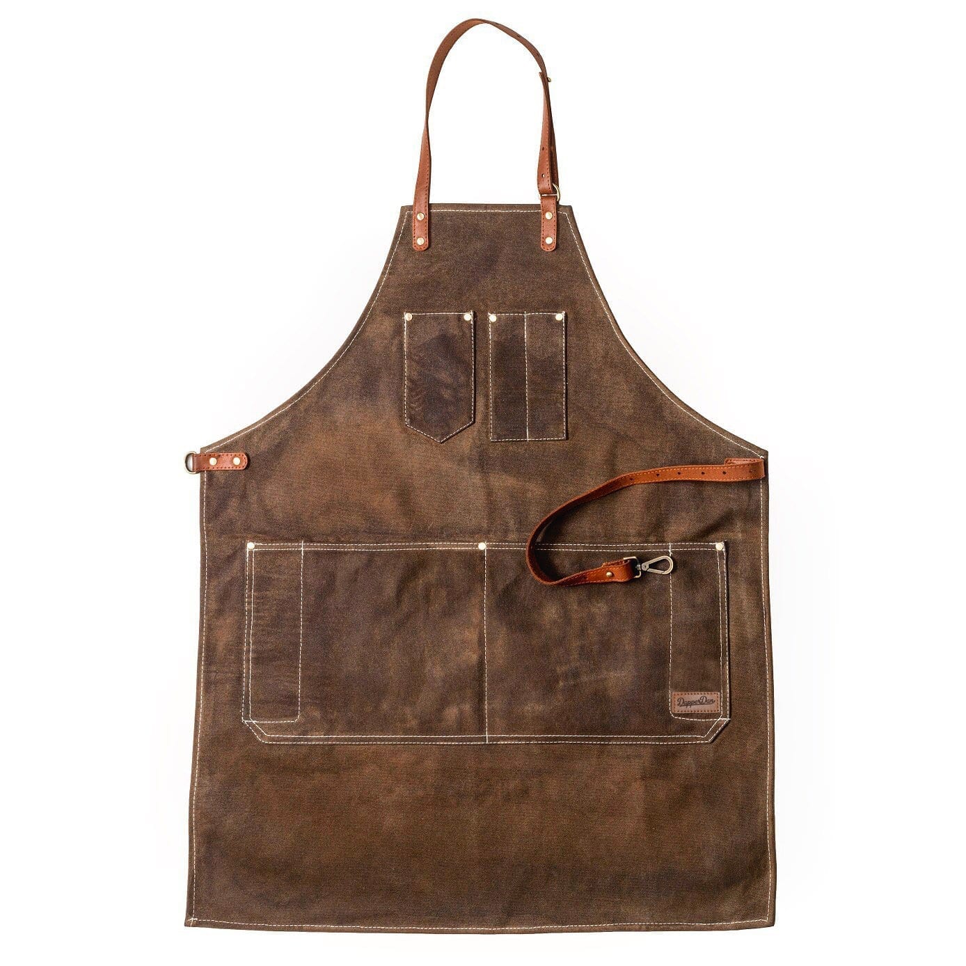 - Ποδιά barber εξαιρετικής ποιότητας φτιαγμένη από κερωμένο καμβά, αληθινό δέρμα και ορύχαλκο.