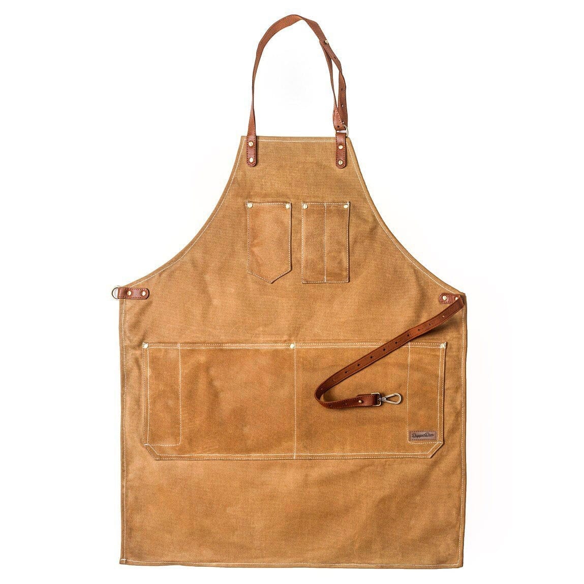 - Ποδιά barber εξαιρετικής ποιότητας φτιαγμένη από κερωμένο καμβά, αληθινό δέρμα και ορύχαλκο.