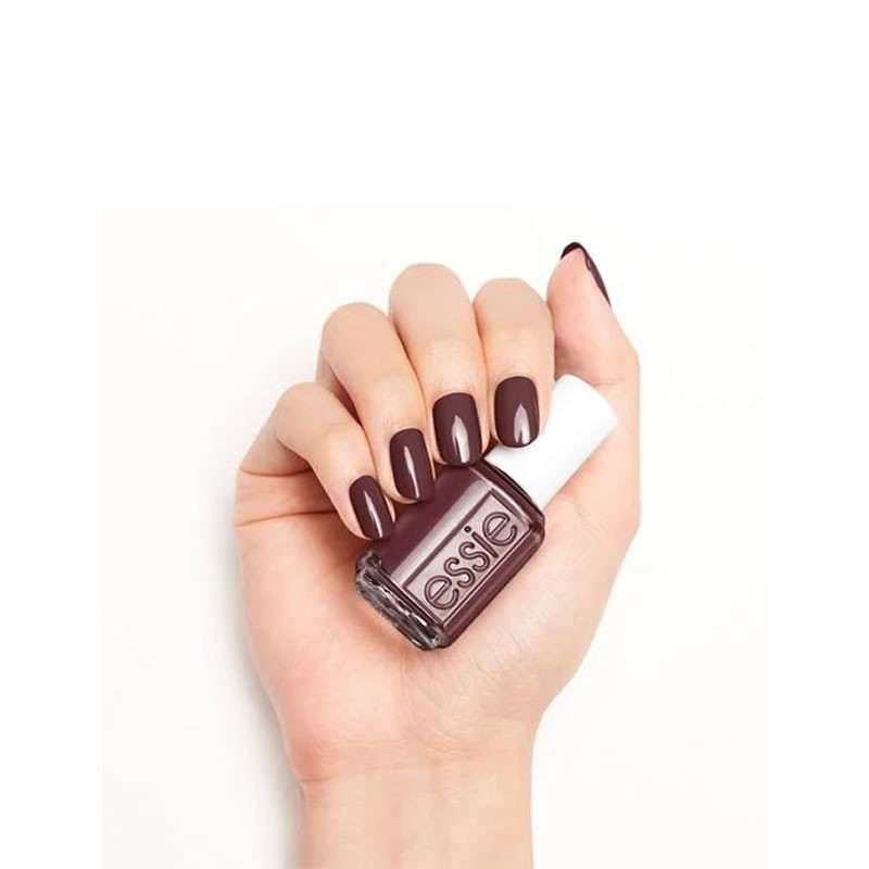 Κρεμώδες, vegan βερνίκι νυχιών σε βαθύ καφέ με κόκκινους υποτόνους, από την Essie.