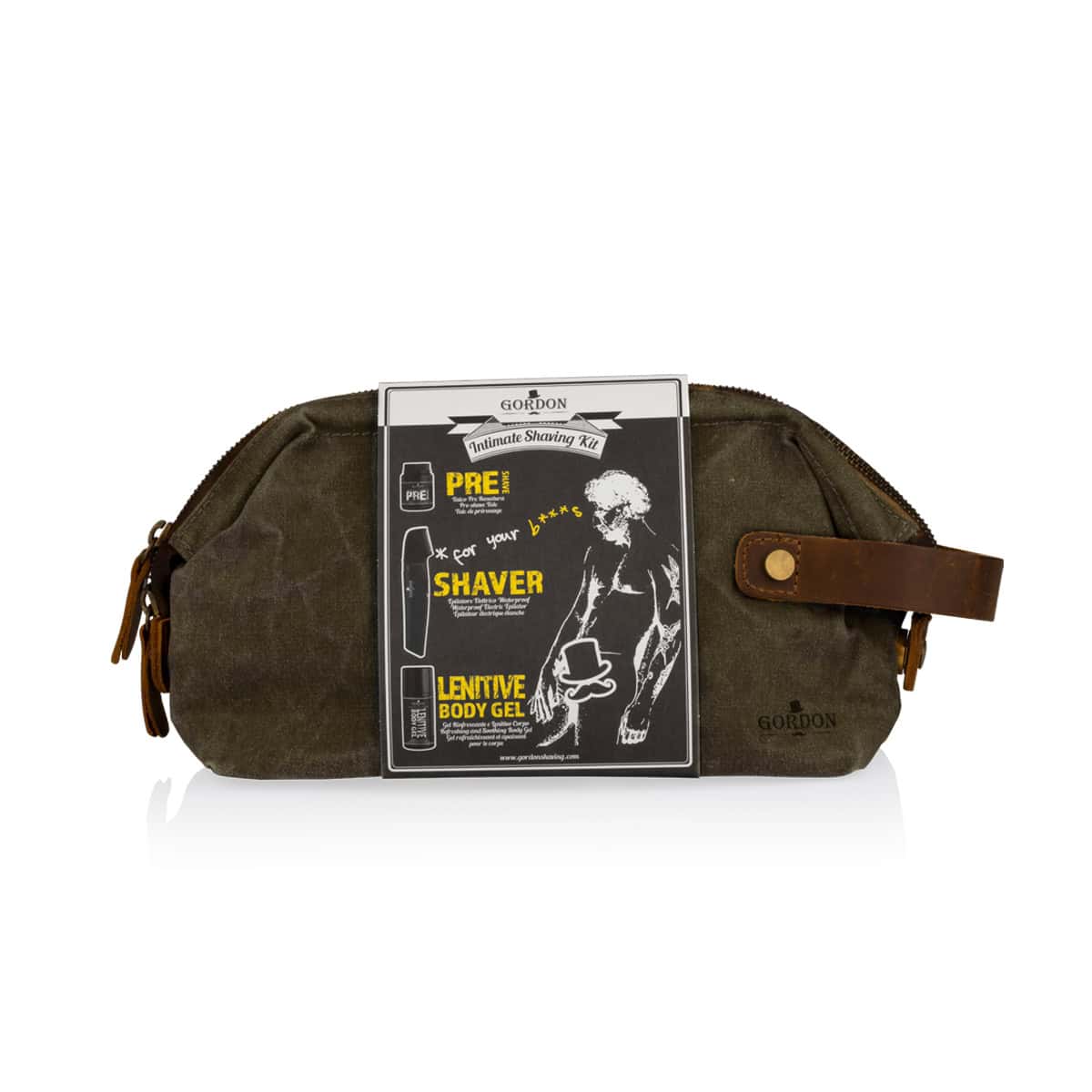 Πρακτικό kit αποτρίχωσης Gordon. Περιέχει μια ξυριστική μηχανή, την σκόνη στεγνού ξυρίσματος Pre Shave και το αναζωογονητικό και καταπραϋντικό Lenitive Body Gel.