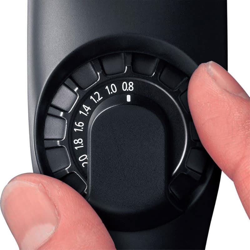Eπιλογέας διαστημάτων 0,2 χιλ. για λεπτομέρεια στη κοπή. Επιλέξτε εύκολα τα μήκη κοπής από 0,8 έως 2,0 χιλ. (διαστήματα των 0,2 χιλ.) χωρίς το εξάρτημα χτένας, επιτρέποντας τη ρύθμιση του μήκους με το ένα χέρι.