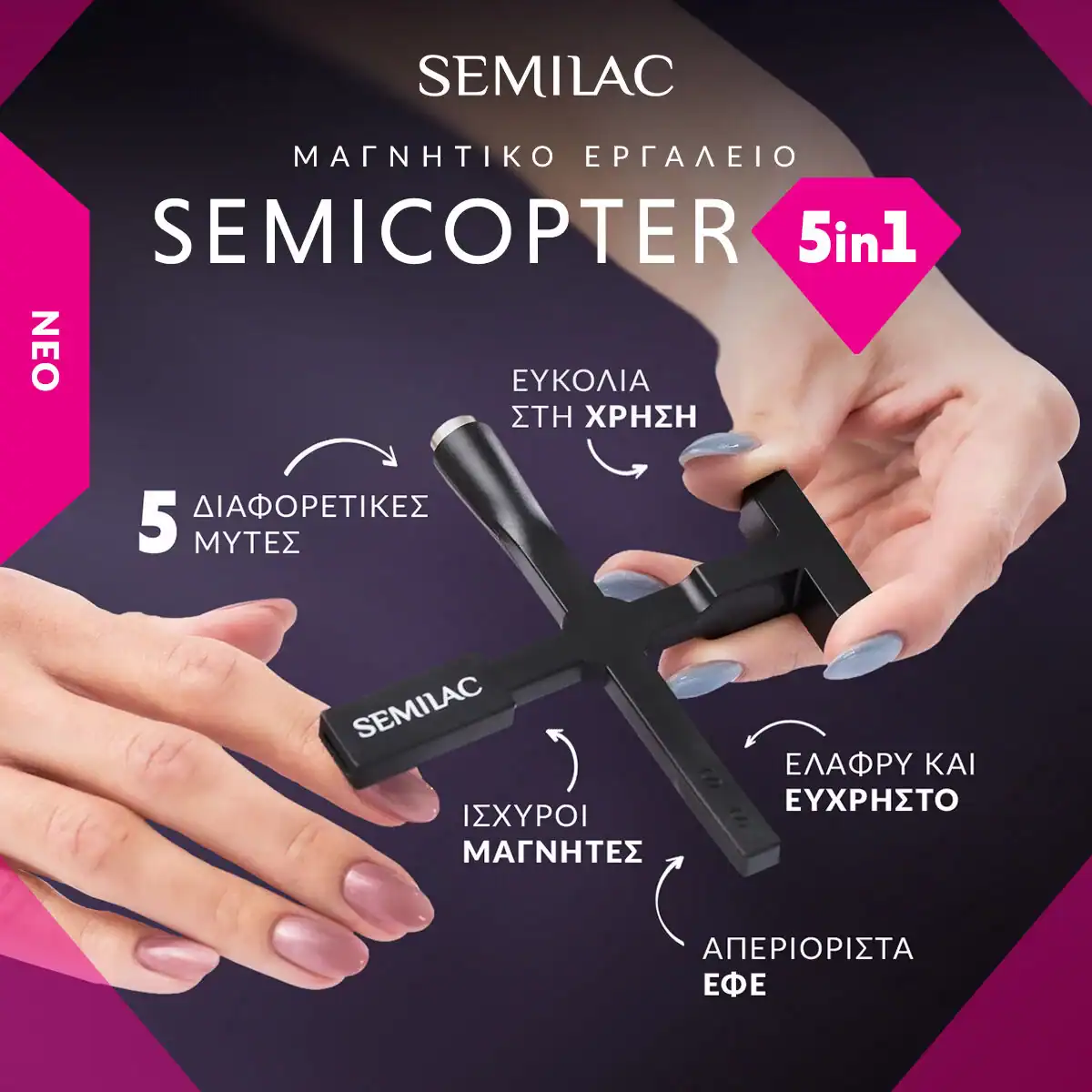 Το Semilac Semicopter 5in1 είναι ένα επαγγελματικό μαγνητικό εργαλείο για δημιουργία μοναδικών nail art σχεδίων με μαγνητικά ημιμόνιμα βερνίκια. Διαθέτει πέντε διαφορετικές μαγνητικές μύτες, προσφέροντας απεριόριστες δυνατότητες στο nail styling: από λεπτές γραμμές και κυματισμούς, έως βαθιά, τρισδιάστατα εφέ που μαγνητίζουν το βλέμμα. Ιδανικό για επαγγελματίες και λάτρεις του nail art, το Semicopter είναι ελαφρύ, εργονομικό και εύκολο στη χρήση. Οι ισχυροί μαγνήτες του προσφέρουν ακρίβεια και σταθερότητα, επιτρέποντας να πετύχεις το τέλειο αποτέλεσμα κάθε φορά