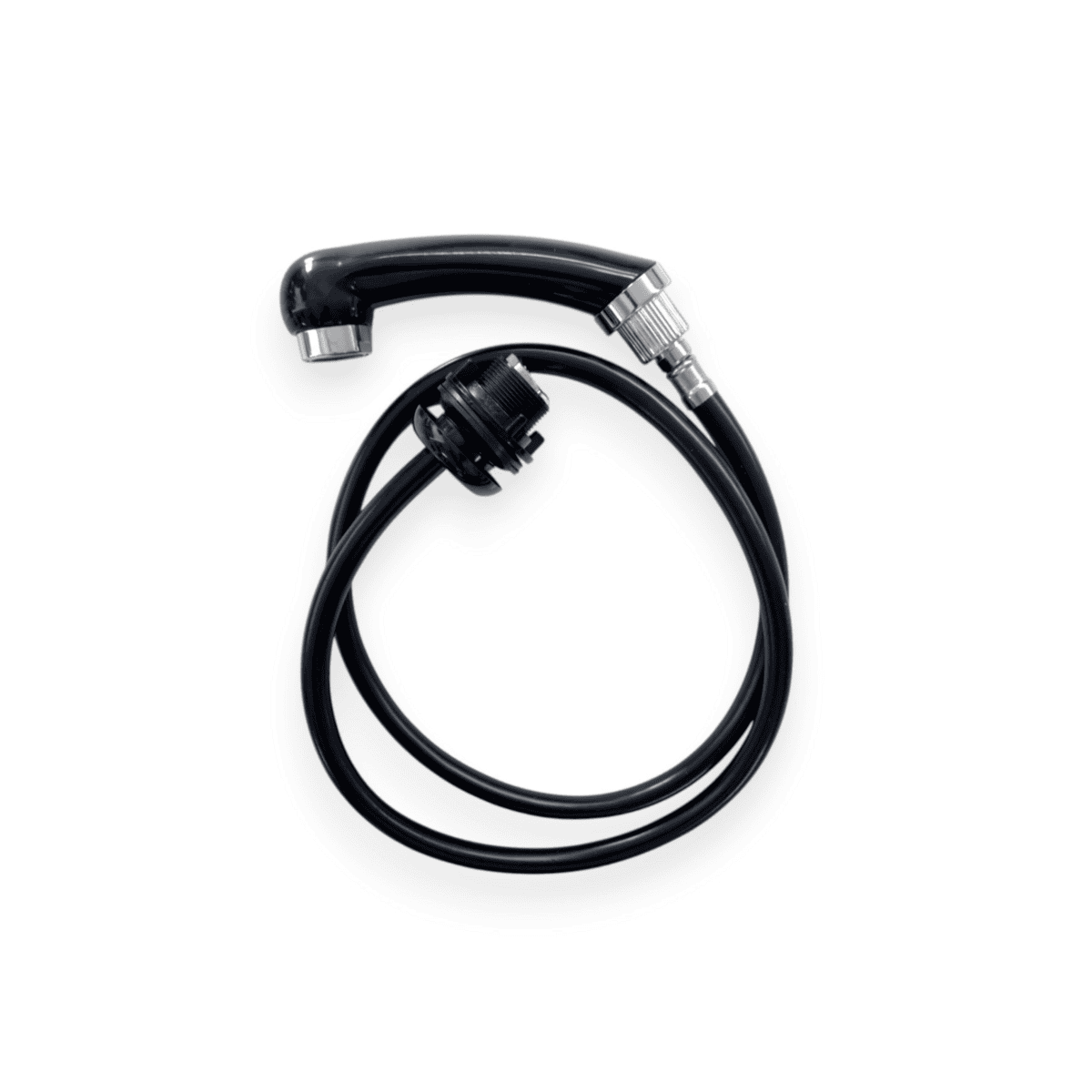 Τηλέφωνο λουτήρα με εύκαμπτο μαύρο σωλήνα, κατάλληλο για επαγγελματική χρήση σε κομμωτήρια. Προσφέρει άνεση και λειτουργικότητα κατά τη διάρκεια του λουσίματος.